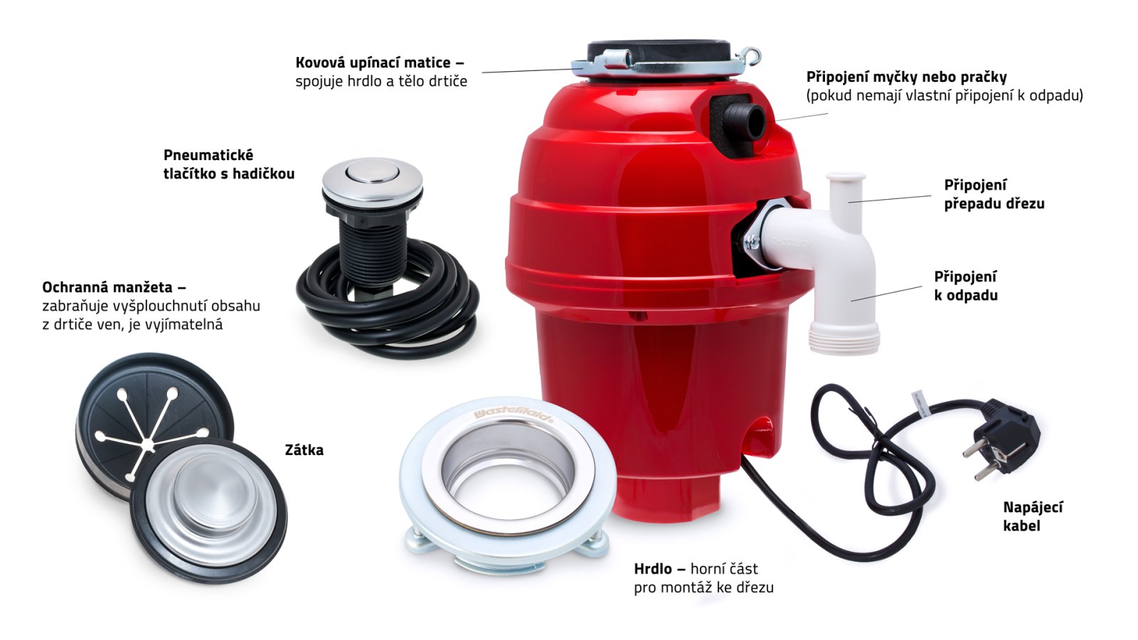 - Waste Maid motory nabízejí maximální točivý moment, okamžitý rozběh a velmi vysoké otáčky, což prakticky znemožňuje zaseknutí přístroje.
